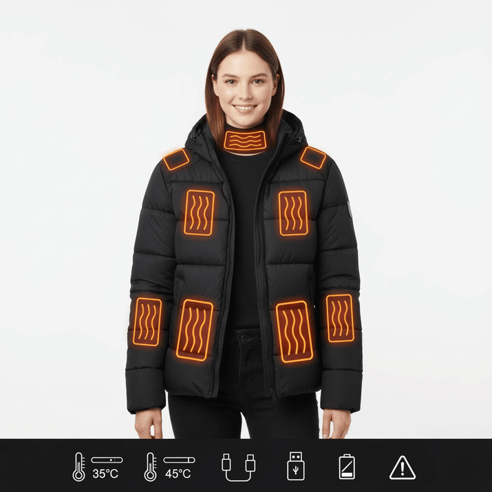Drei Heizstufen für optimalen Komfort bei kaltem Wetter.Leicht, wasserabweisend und perfekt für Alltag oder Reisen.